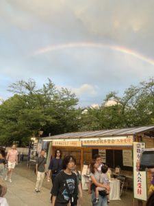 7月の東京、夏の風物詩といえば、お祭りや盆踊りですね〜♪  そんなこんなで靖国神社のみたままつりに行ってきました。あの幻想的な黄色い提灯に心奪われる季節がやってきました。それだけでも気分が上がるのに、夕方頃空には大きな虹が、靖国神社の上空にかかっていました!何とも初日に相応しい光景でして、まさに神がかり。人々の祈りと日本の夏の空気と、ちょっと湿った風とが重なって、まるで天が祝福してくれているような、そんな時間でした。屋台の香りや、ゆかた姿の人々の笑顔、そして何より、空にかかったあの虹🌈がサプライズプレゼントでラッキーでした✌️